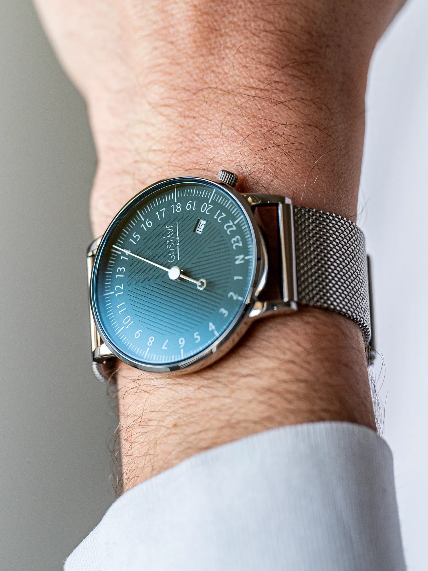 Les montres André ne possèdent qu’une seule aiguille qui indique les heures et les minutes simultanément. Sur nos collections 24 heures, l’aiguille ne fait qu’une seule fois le tour du cadran dans la journée.