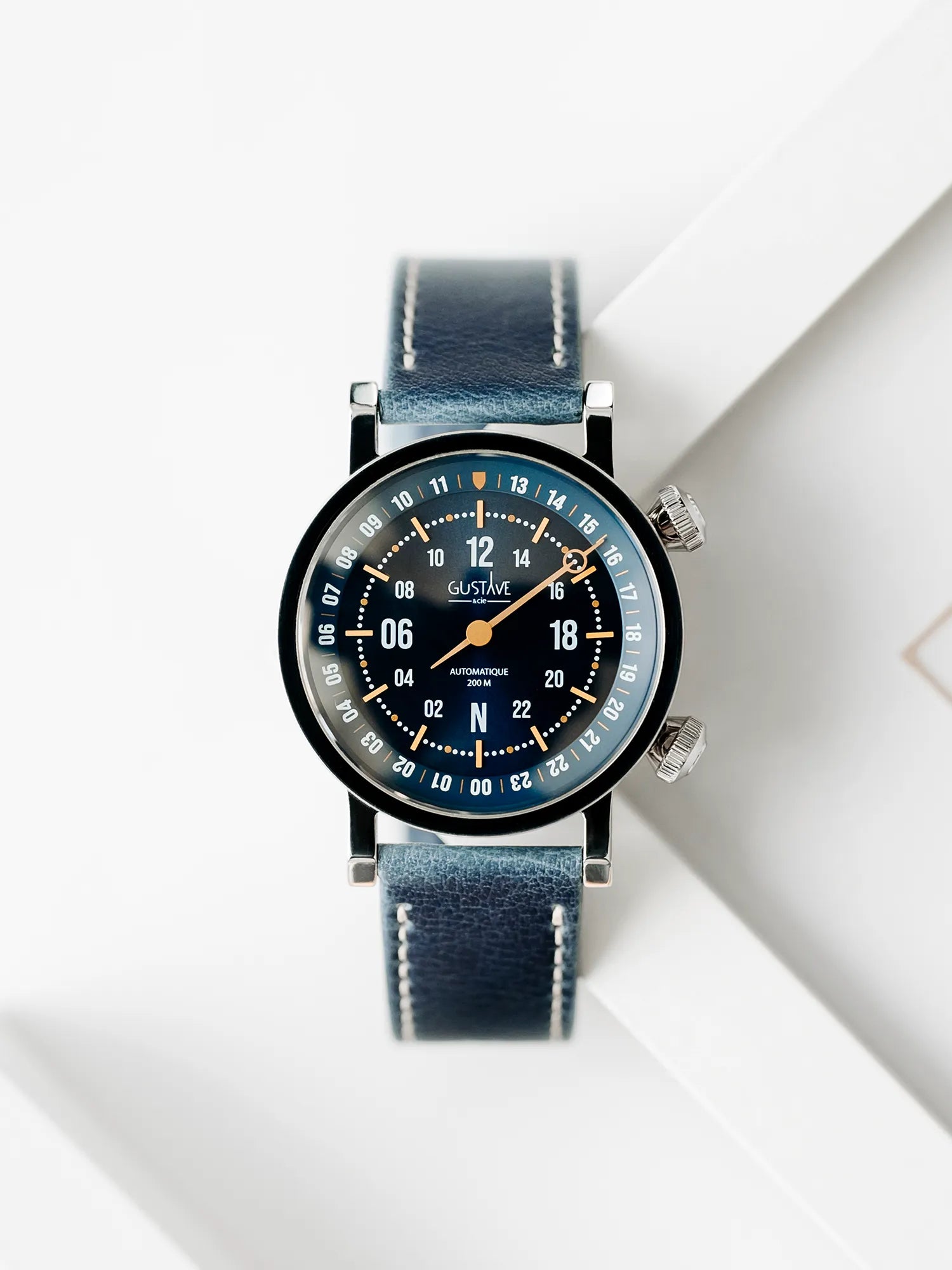 La collection “Jules” est une ode à Jules Verne, écrivain français passionné de navigation, auteur de nombreux romans d’aventures tel que “Vingt mille lieues sous les mers”. Pour cette collection, le thème marin est donc central mais la montre est adaptée à tous les aventuriers, sur terre comme sur mer.