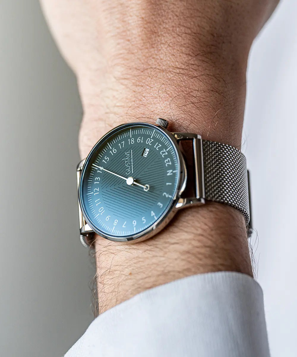 Pour GUSTAVE et cie, il n’y a pas de taille de montre « idéale ». Néanmoins, si votre poignet mesure moins de 15cm, il est fortement conseillé de se diriger vers un boîtier 36mm. Inversement, si votre poignet mesure plus de 18cm, nous préconisons un boîtier de 40mm.