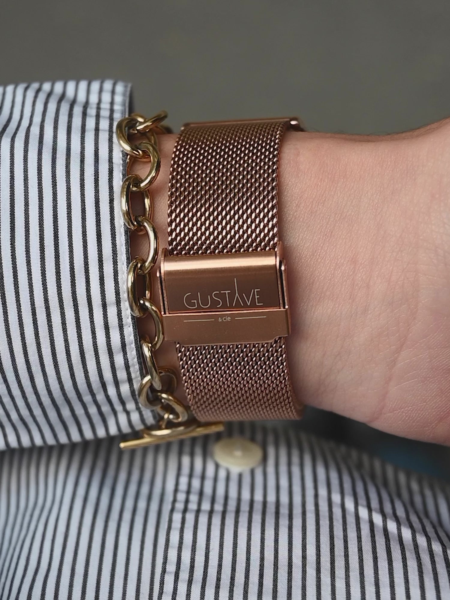 Grâce au système de barrette à ergot, vous pouvez changer de bracelet en moins de dix secondes sans outil. Bien faire attention à mettre la partie du bracelet avec la boucle en haut de la montre au niveau du 12h.