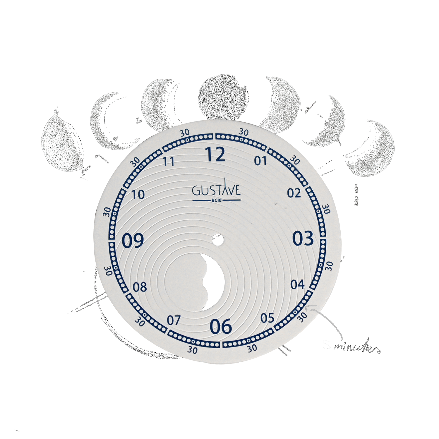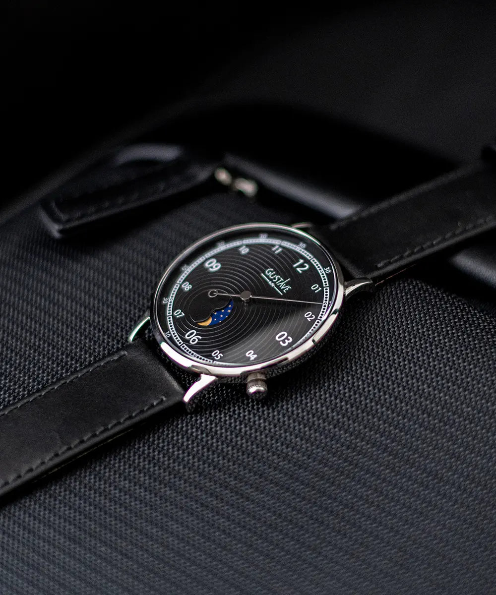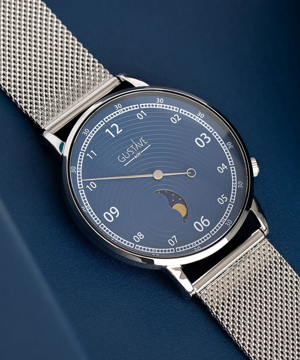 Minimaliste et poétique, le cadran de la montre Georges s’inspire de l’univers onirique du pionnier du cinéma. Sa phase de lune fait référence au film emblématique Le Voyage dans la Lune, et en arrière-plan, un embossage délicat de cercles concentriques suggère les anneaux d’une orbite ou les cycles lunaires.