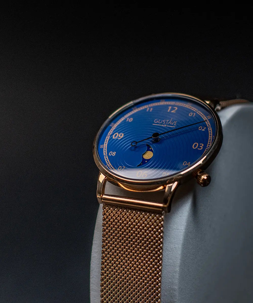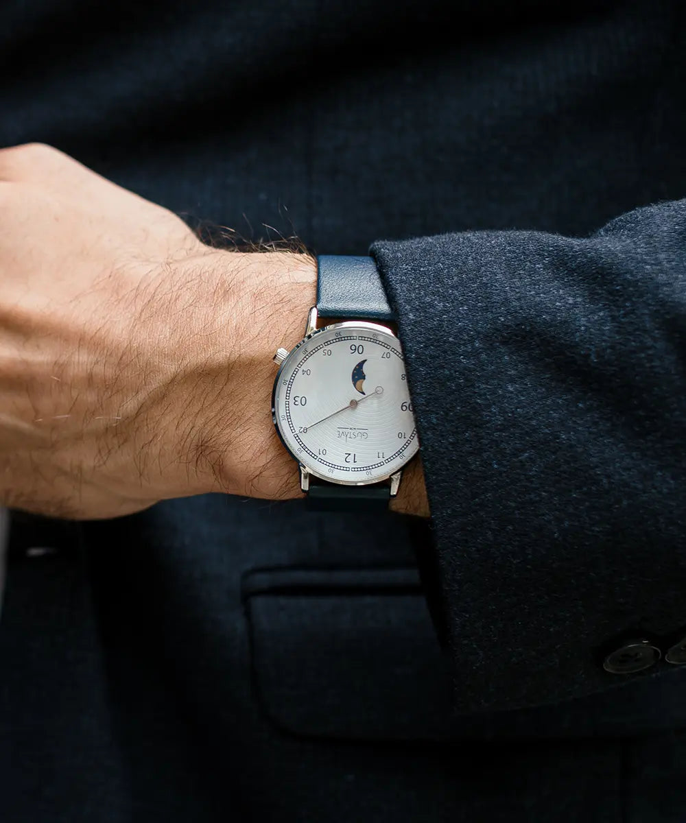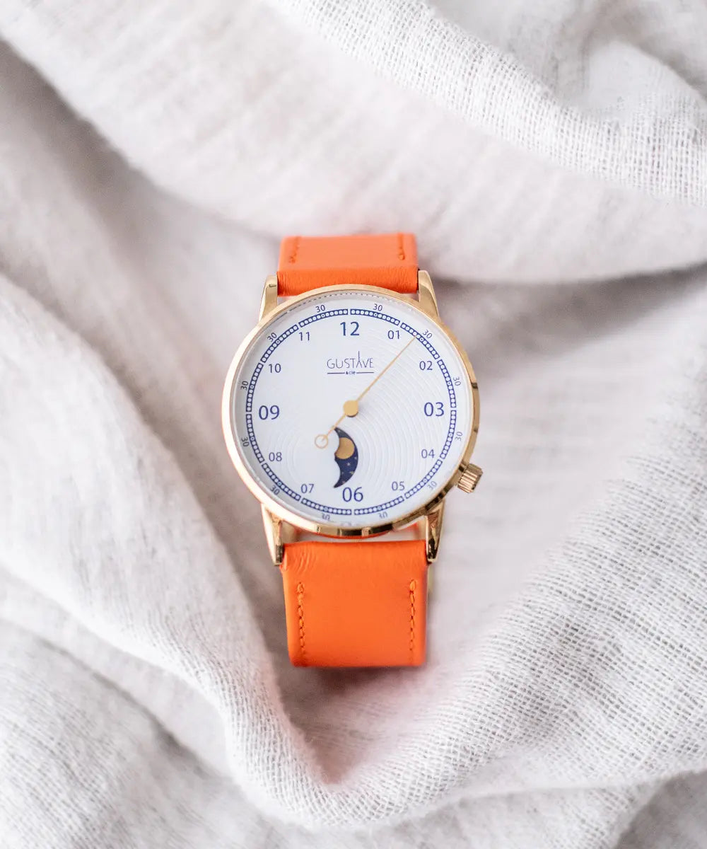 Le tout est protégé par un verre saphir bombé accentuant la profondeur du cadran et faisant directement écho à la courbure de la Lune. Sur cette collection, chaque index de la montre Georges représente 5 minutes et les demi-heure sont également marquées.