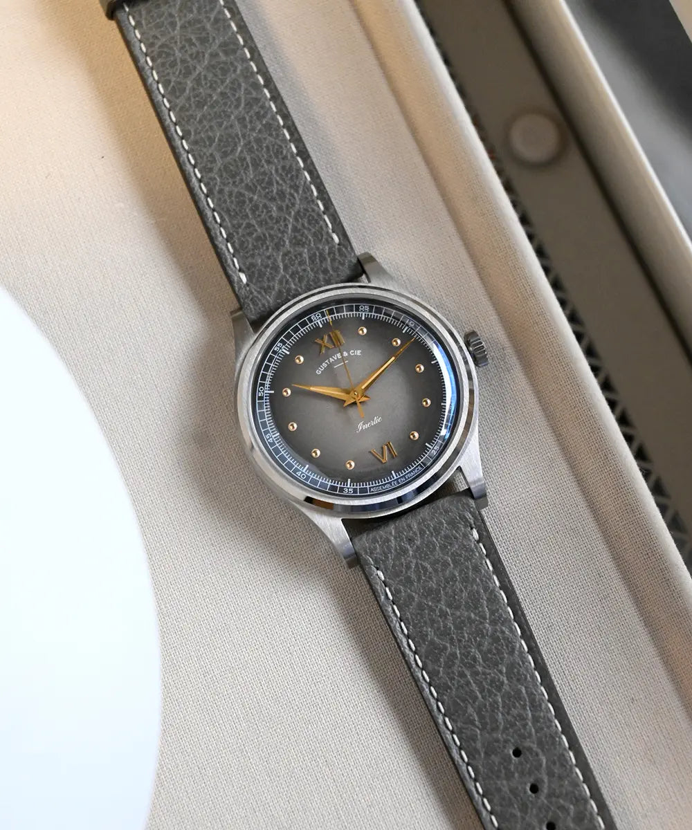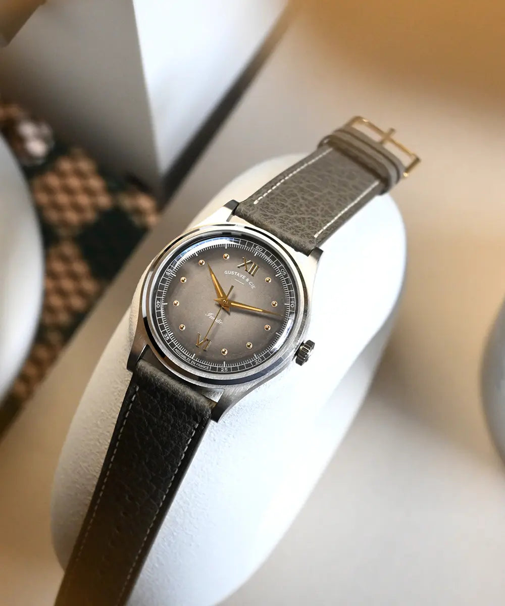 Le cadran de la collection Léon rend visible le mouvement du temps. Ses index appliqués en demi-sphère évoquent la trajectoire du pendule, oscillant avec précision et régularité. La surface laquée, disponible en dégradé marron ou dégradé gris, change d’intensité selon l’angle du regard.