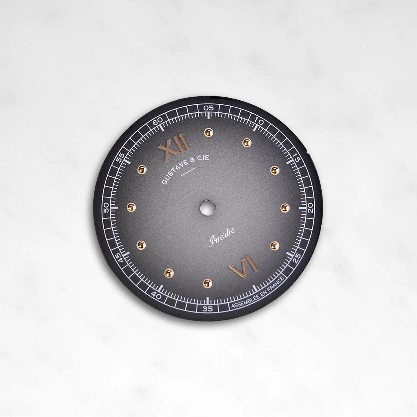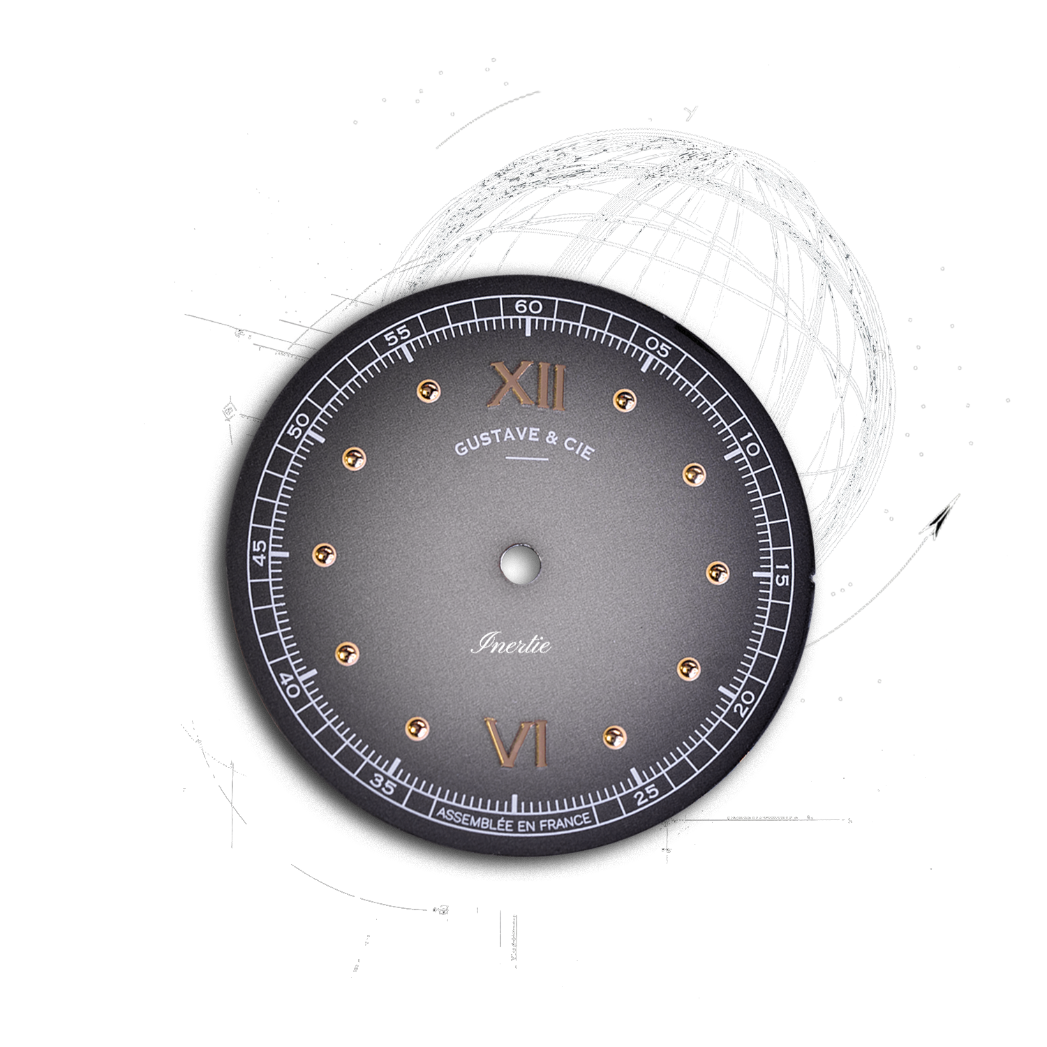 À 6 heures, le mot « Inertie » rappelle le principe même qui relie la montre au pendule : celui d’un équilibre subtil entre la science du temps et sa poésie.