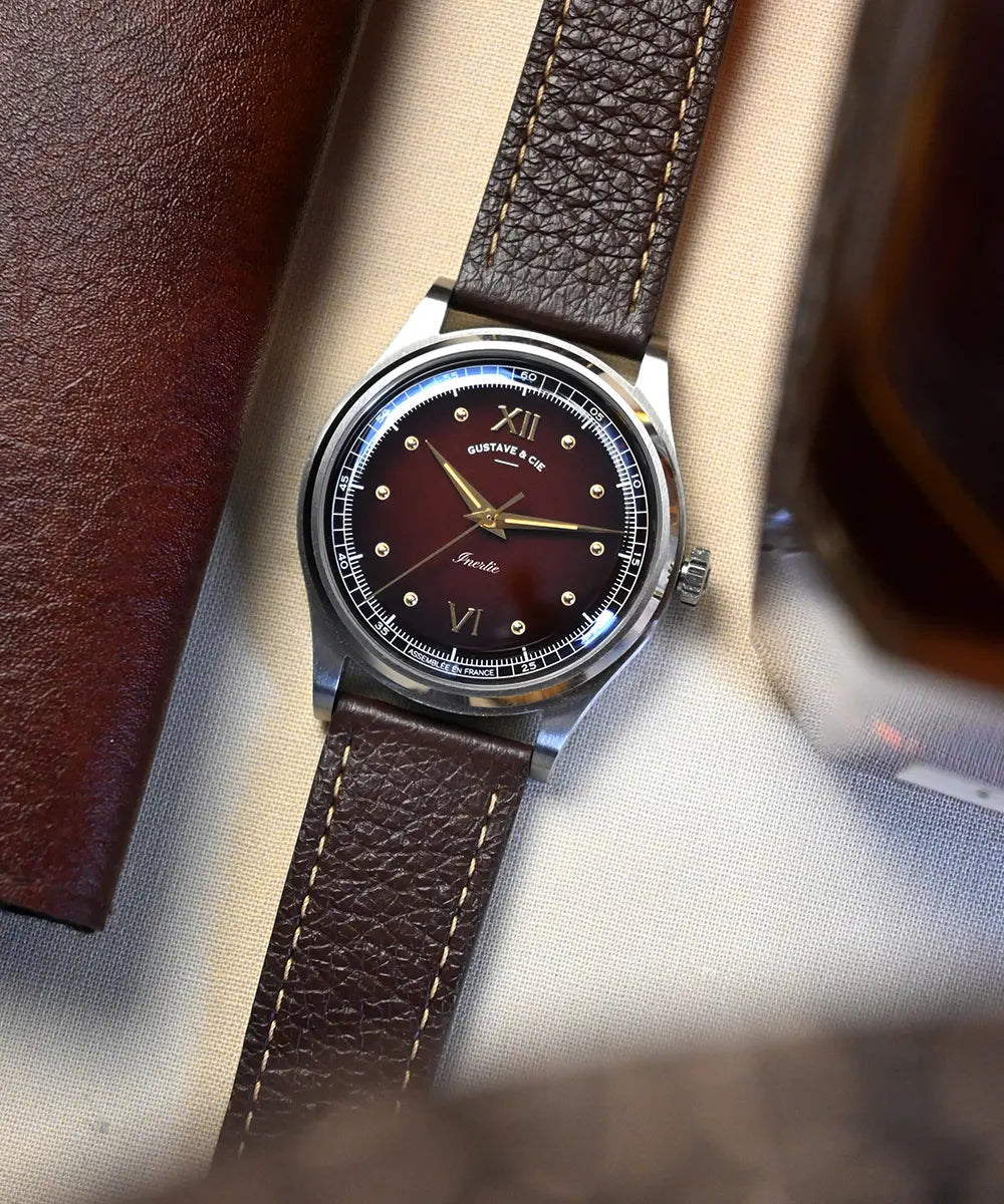 Le cadran de la collection Léon rend visible le mouvement du temps. Ses index appliqués en demi-sphère évoquent la trajectoire du pendule, oscillant avec précision et régularité. La surface laquée, disponible en dégradé marron ou dégradé gris, change d’intensité selon l’angle du regard.
