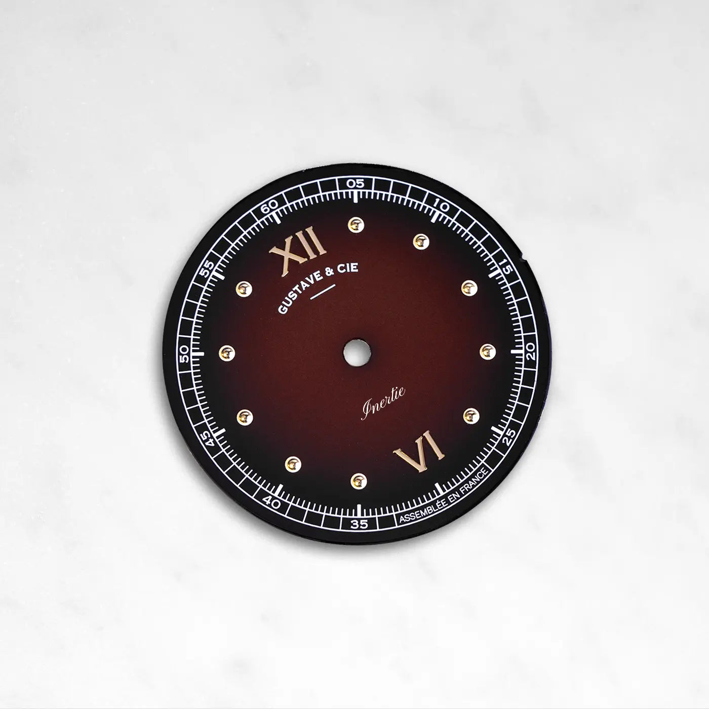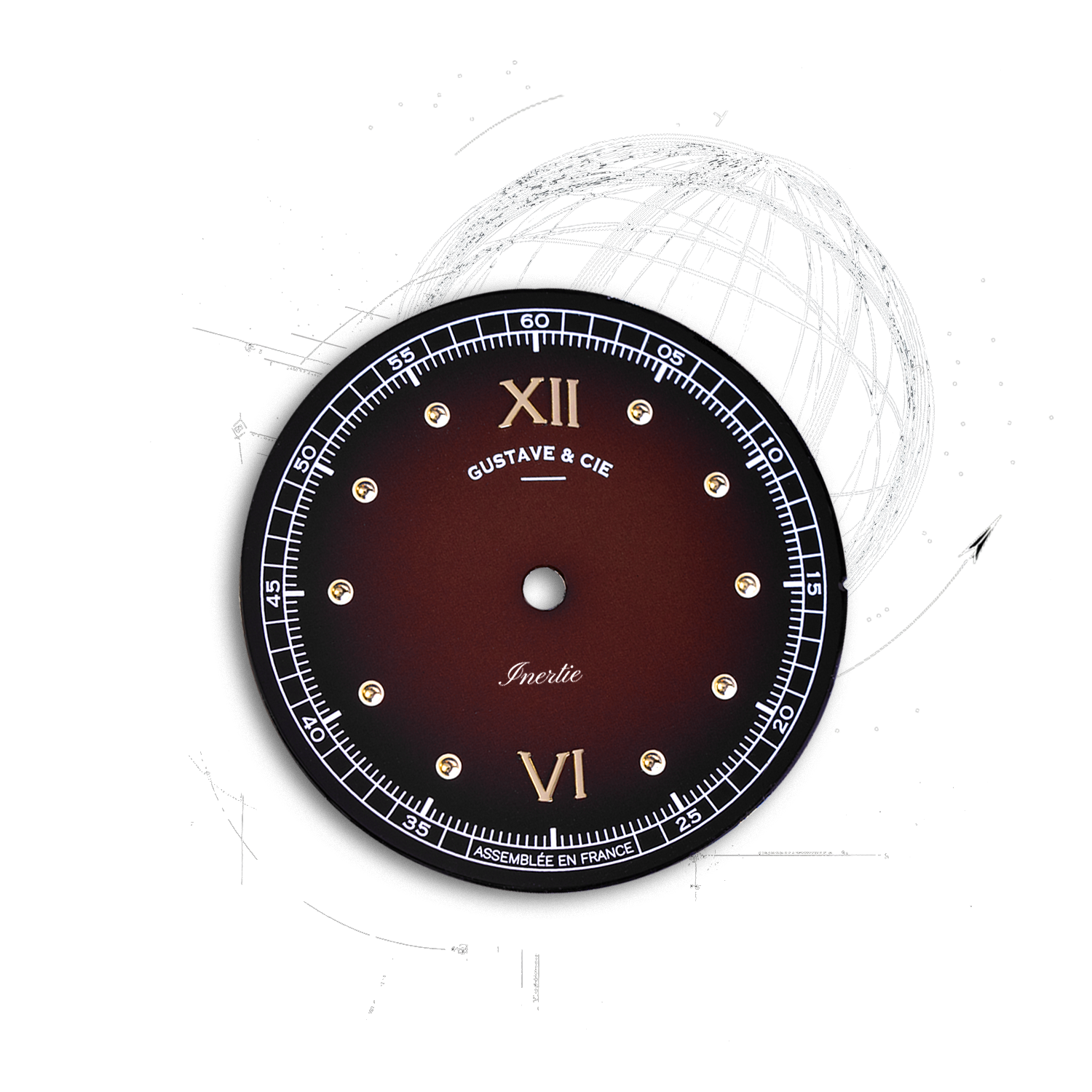 À 6 heures, le mot « Inertie » rappelle le principe même qui relie la montre au pendule : celui d’un équilibre subtil entre la science du temps et sa poésie.